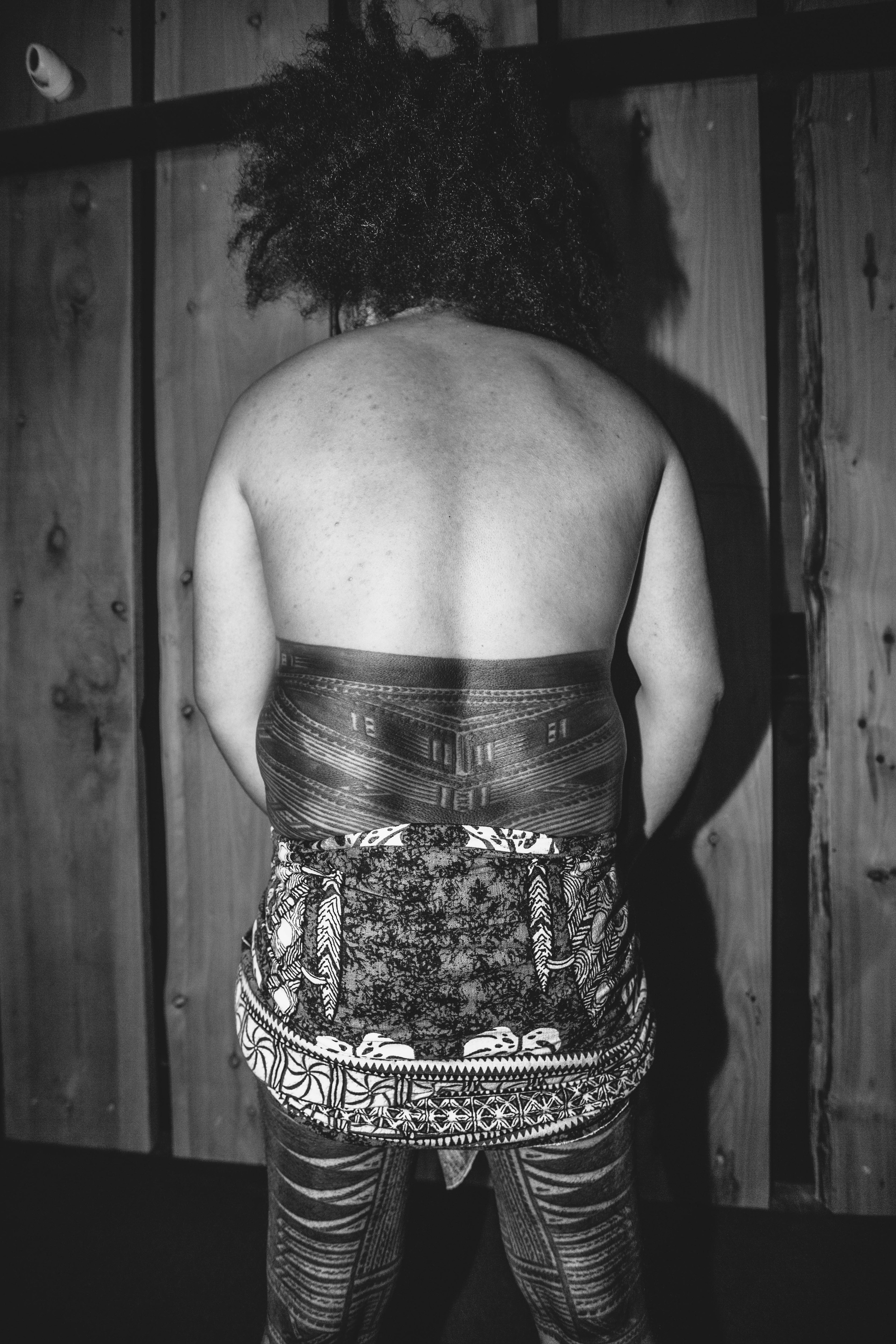 The pe’a is a traditional Samoan tattoo worn by men, covering the body from torso to knees. Young men receive it as a rite of passage into adulthood. This initiation is a critical and highly ritualised event in a Samoan man’s life, signalling the transition from one stage of being—adolescence—to another, more evolved, state. Traditionally, this process takes five days (although often it can take weeks) and is extraordinarily painful: rudimentary combs of different sizes, each made up of razor-sharp teeth attached to a turtle shell attached at a right angle to a stick, are repeatedly dipped into ink and tapped into the skin using a mallet, known as iapalapa. The tufuga (tattooist) tattoos freehand without any guide to reference. The design is made up of perfectly symmetrical lines, triangles, arrows, dots, and other geometric patterns. Each element is imbued with sacred, mythological meaning, and, equally meaningfully, the tattooing begins on the spine, moves around the torso, up the hips, encapsulates the thighs and buttocks, and ends around and inside the belly button.